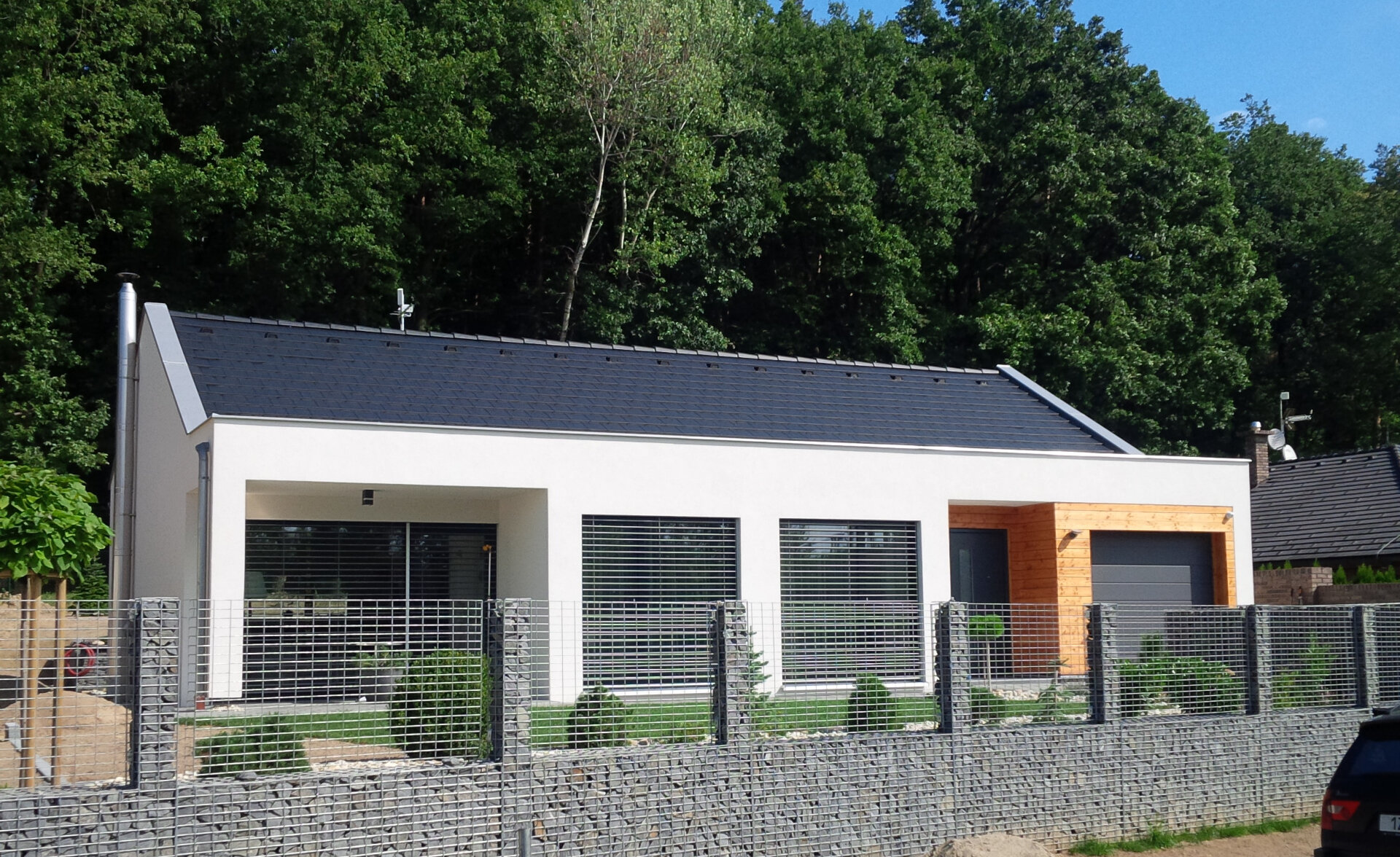• kombinace obložení z dřevěného roštu a bílé omítky